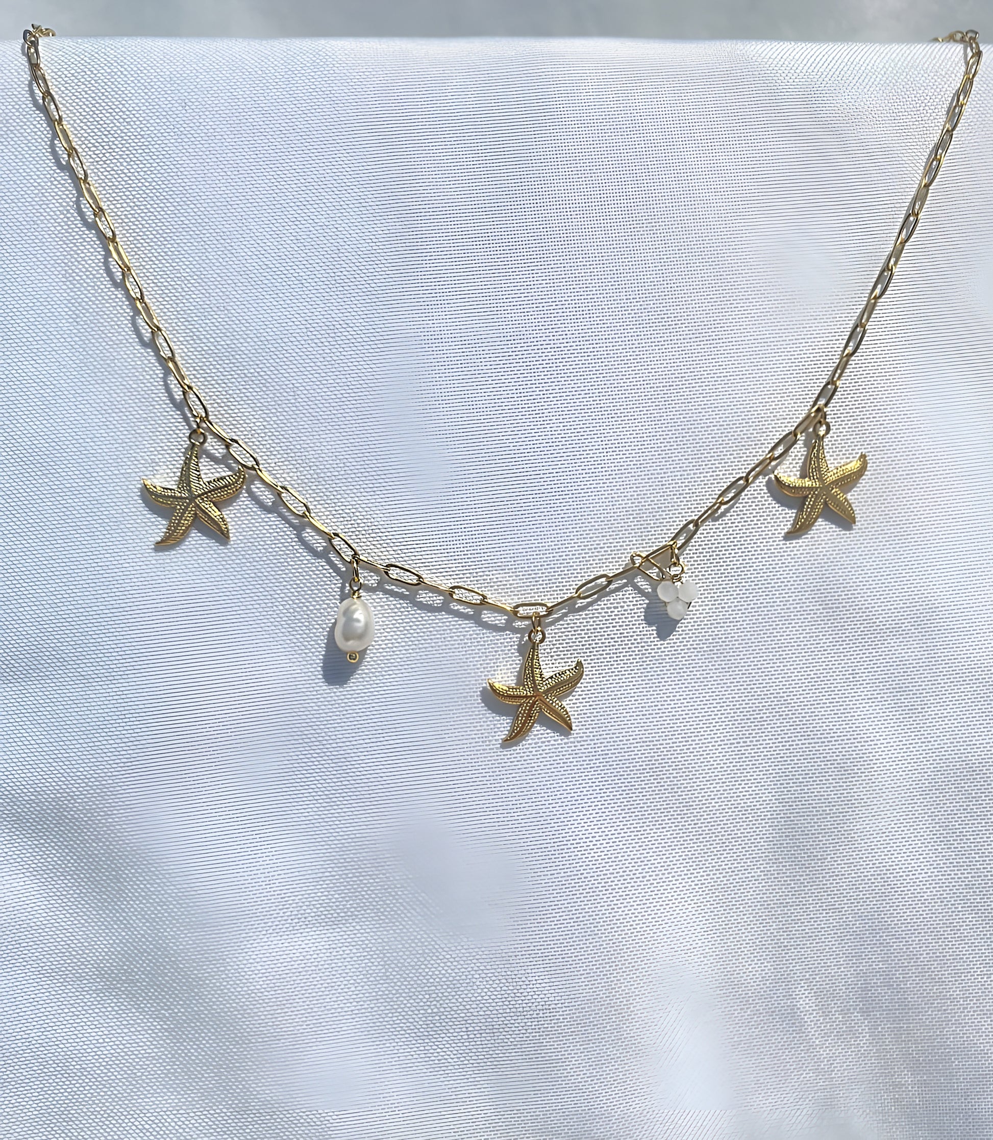 multicharms doré, associant des étoiles de mer emblématique et perles blanches.
