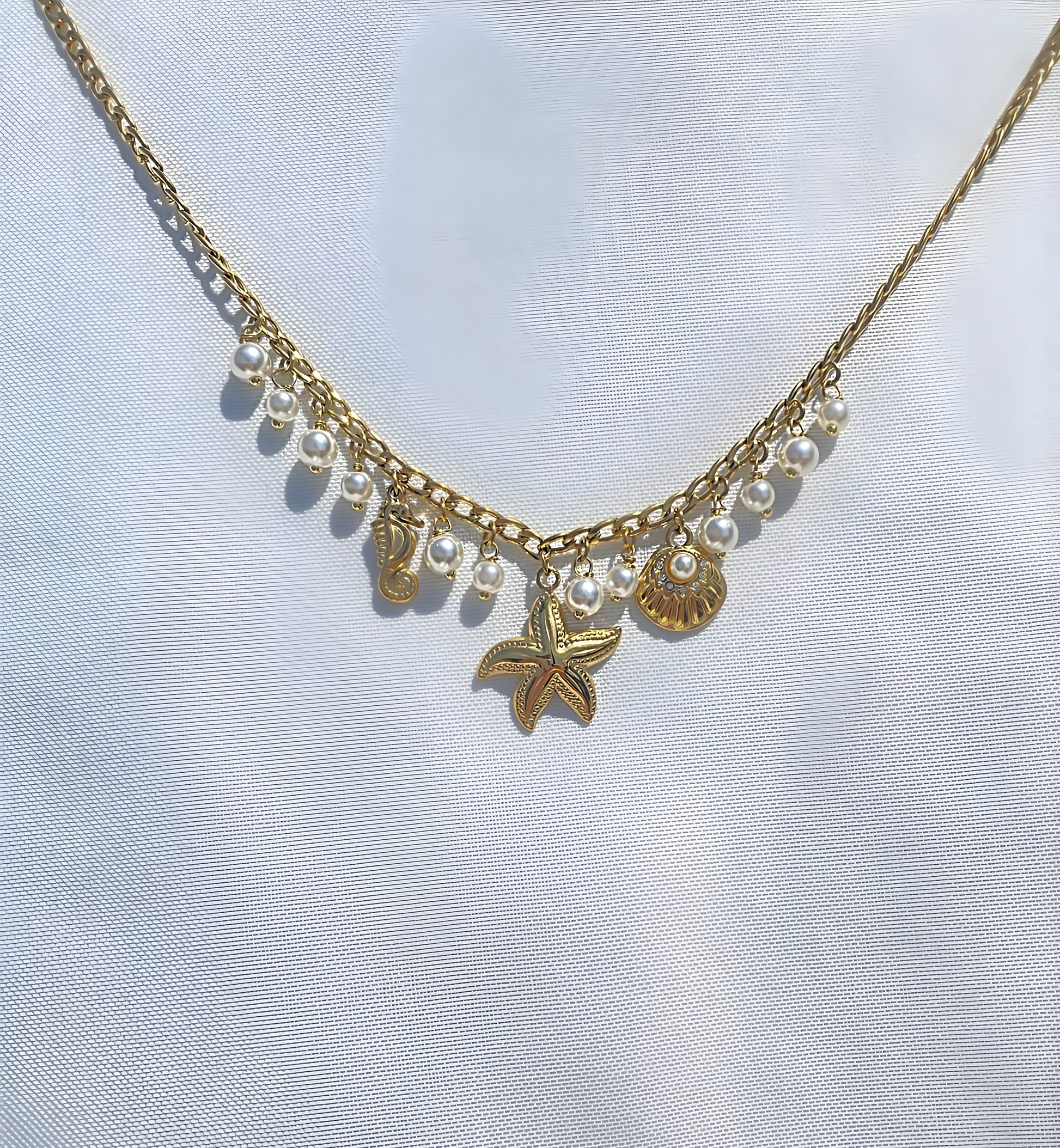 Ce collier magnifié par une succession de perles blanches, accompagnées de trois breloques évoquant la mer.